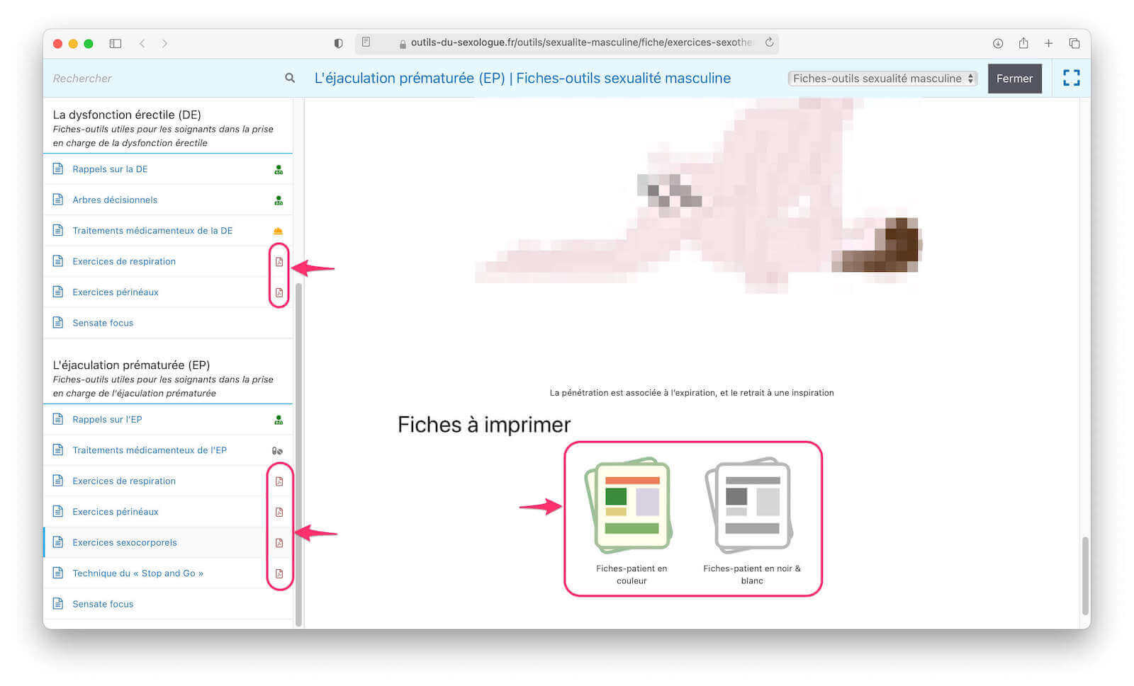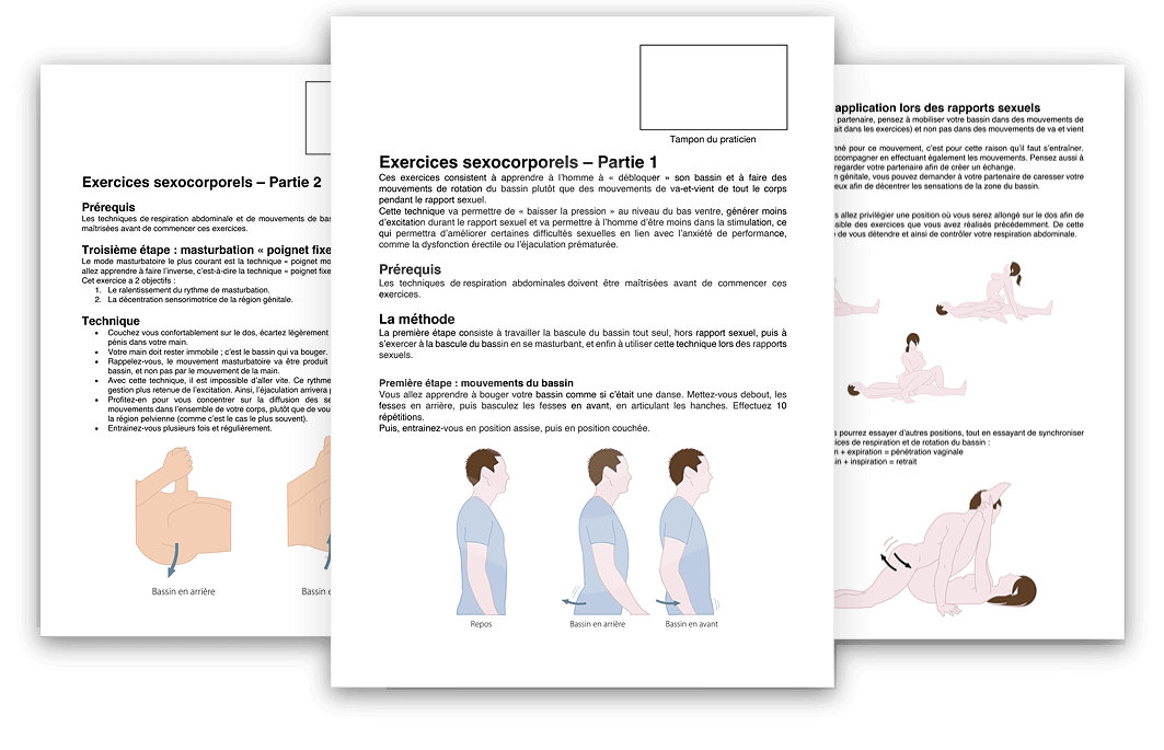 5. Exercices sexocorporels : des fiches toutes prêtes à remettre à votre patient qui contiennent un ensemble d’exercices basés sur les techniques sexo-corporelles, approche qui montre très bons résultats dans la prise en charge de l’éjaculation prématurée