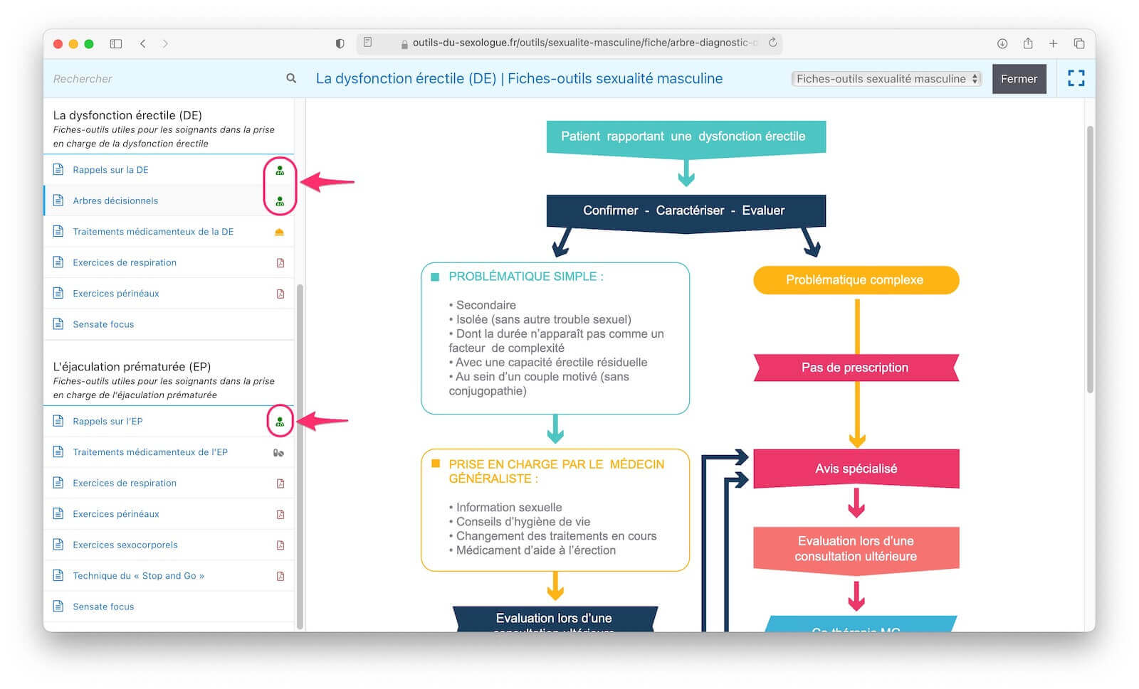 Nos fiches-outils contiennent également des fiches-mémos pour les soignants avec quelques rappels concernant la physiopathologie, le diagnostic et le traitement des différentes dysfonctions sexuelles masculines.