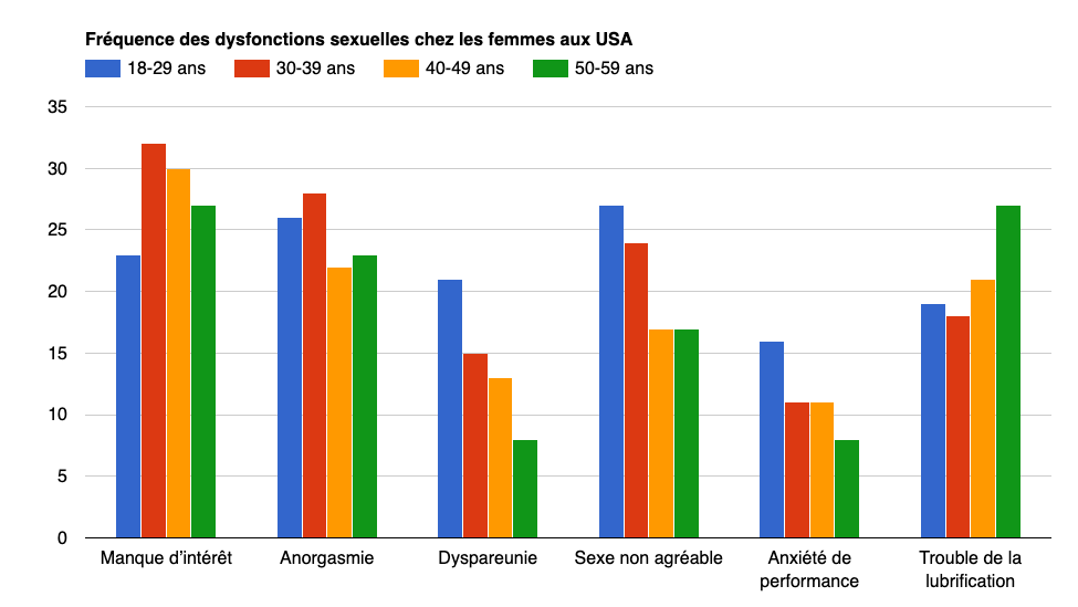 | Manque d’intérêt | Anorgasmie | Dyspareunie | Sexe non agréable | Anxiété / performance | Trouble de la lubrification | |
