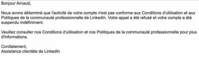 Nous avons en effet été avertis le 14 décembre, via un message probablement automatique, que le compte professionnel du Dr ZELER avait été suspendu de façon définitive, car le service clientèle (ou plutôt l’algorithme qui analyse le contenu des posts) aurait déterminé que « l’activité de [son] compte n’est pas conforme aux Conditions d’utilisation et aux Politiques de la communauté professionnelle de LinkedIn« .