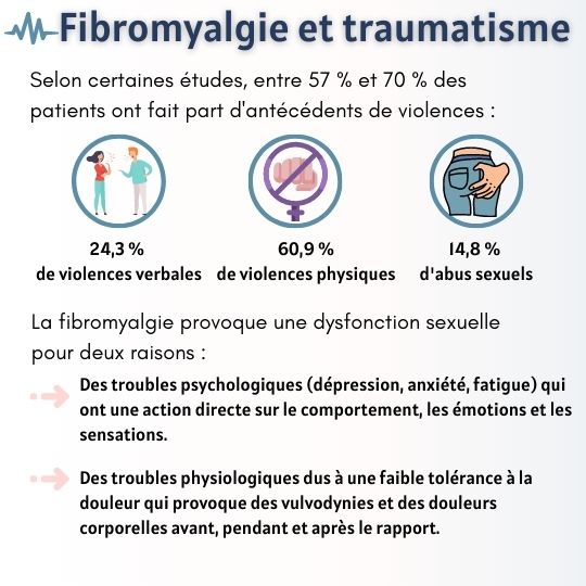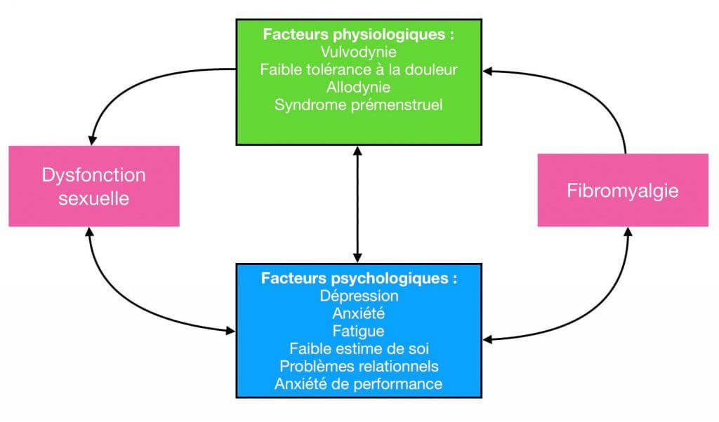 Chez les patientes atteintes de fibromyalgie, la lubrification se fait moins bien, et le seuil à partir duquel la douleur est ressentie est plus bas que la normale, ce qui explique les dyspareunies.