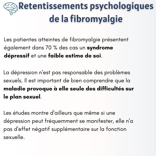 Ces études montrent clairement des indices de satisfaction sexuelle plus faible chez les femmes souffrant de fibromyalgie, avec des valeurs significativement altérées de tous les paramètres du Female Sexual Function Index (FSFI) : désir, excitation, lubrification, orgasme et satisfaction sexuelle9