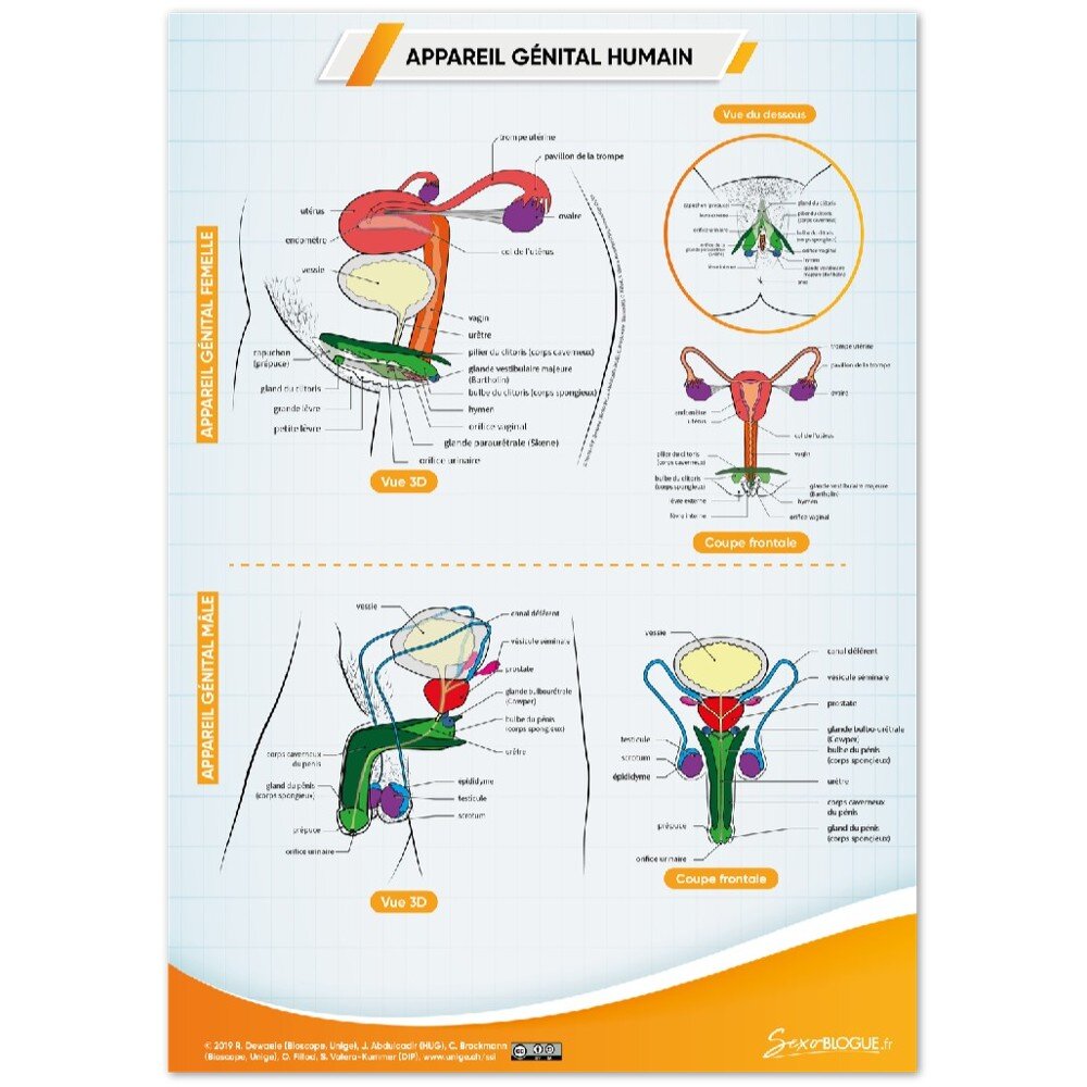 Ce poster de qualité supérieure, basé sur les planches anatomiques des organes génitaux développées par le Bioscope, les Hôpitaux Universitaires de Genève, le DIP et Odile Fillod, est fait pour vous !