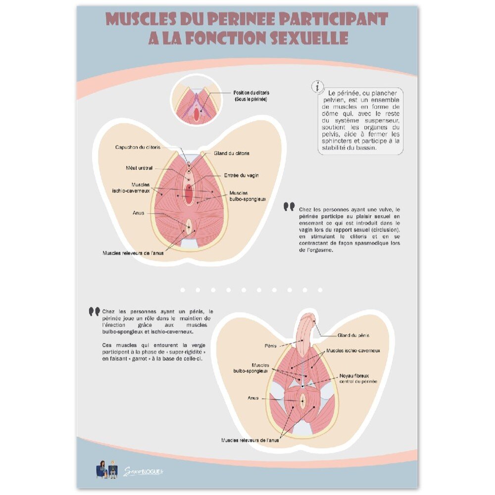 Vous cherchez un poster qui présente de façon simple et compréhensible les muscles du périnée qui participent à la fonction sexuelle, avec un design moderne et coloré ?